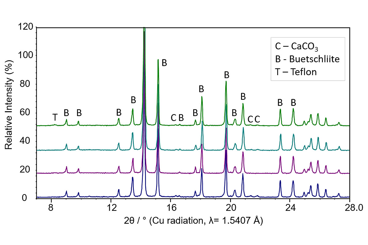 A 1:1 molar ratio of K2CO3 and CaCO3 (total mass of 0.5 g) was milled in the 5 ml jars for 2 h at 30 Hz. 3 x 7 mm steel balls per jar were used, corresponding to a B/P ratio of 8.4:1. The reaction to buetschliite K2Ca(CO3)2 was successful and reproducible in the 4 jars. Results presented by the group of Claudia Weidenthaler. [8]